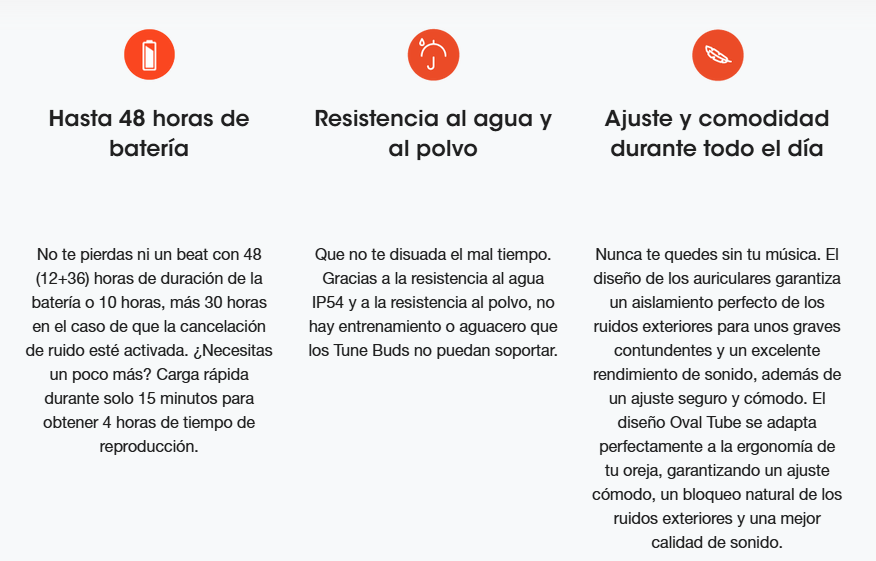 Afronta tu día canción a canción con los JBL Tune Buds. Estos auriculares True Wireless te ofrecen hasta 48 horas de excepcional sonido JBL Pure Bass, mientras que su diseño ergonómico y resistencia al agua y al polvo te proporciona comodidad durante todo el día en cualquier clima. Un simple toque te permite gestionar y disfrutar de llamadas perfectas en cualquier lugar, sin ruidos ambientales. Y con la tecnología Active Noise Cancelling (ANC) y Smart Ambient, tú eliges si quieres desconectar del mundo o relacionarte con tu entorno. El diseño de botón garantiza un aislamiento perfecto de los ruidos exteriores y un ajuste seguro. Y lo mejor de todo es que la aplicación JBL Headphones te permite personalizar tu experiencia auditiva. Conecta con tu mundo a tu manera.