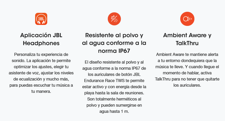 Los auriculares de botón activos JBL Endurance Race True Wireless están siempre preparados. Con 30 horas de batería y un diseño resistente al agua y al polvo, ofrecen el mejor sonido JBL Pure Bass con una gran comodidad durante todo el día. El ajuste resistente y superior te permite estar siempre activo, desde la playa hasta la sala de reuniones, gracias a su diseño sellado y estable. Pregunta a tu asistente de voz preferido, gestiona el audio y realiza llamadas perfectas con solo tocar un botón. Y cuando necesites escuchar lo que te rodeas, hazlo con un sonido ambiental mejorado.