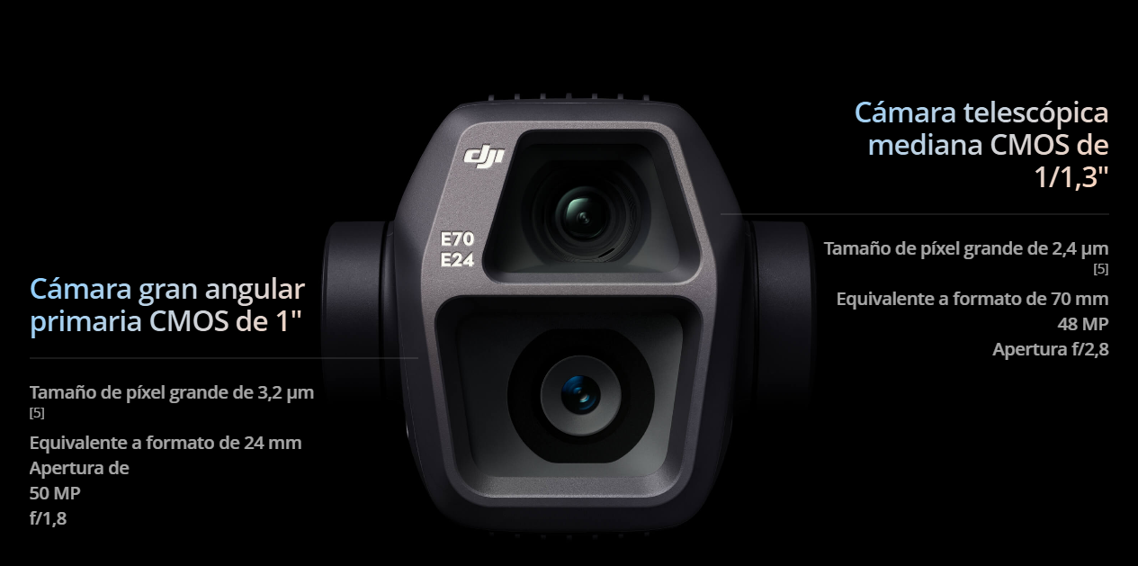 El DJI Air 3S cuenta con un sistema de cámara dual que consta de una cámara principal con CMOS de 1 pulgada y una cámara telefoto mediana con CMOS de 1/1,3 pulgadas. La cámara principal cuenta con un sensor CMOS más grande y una lente de 24 mm, lo que la hace ideal para capturar paisajes extensos con mayor claridad y un campo de visión amplio. La cámara telefoto mediana de 70 mm se destaca en retratos y fotografías de vehículos, ofreciendo una profundidad de campo comprimida para resaltar cualquier sujeto con un aspecto más audaz y cinematográfico.