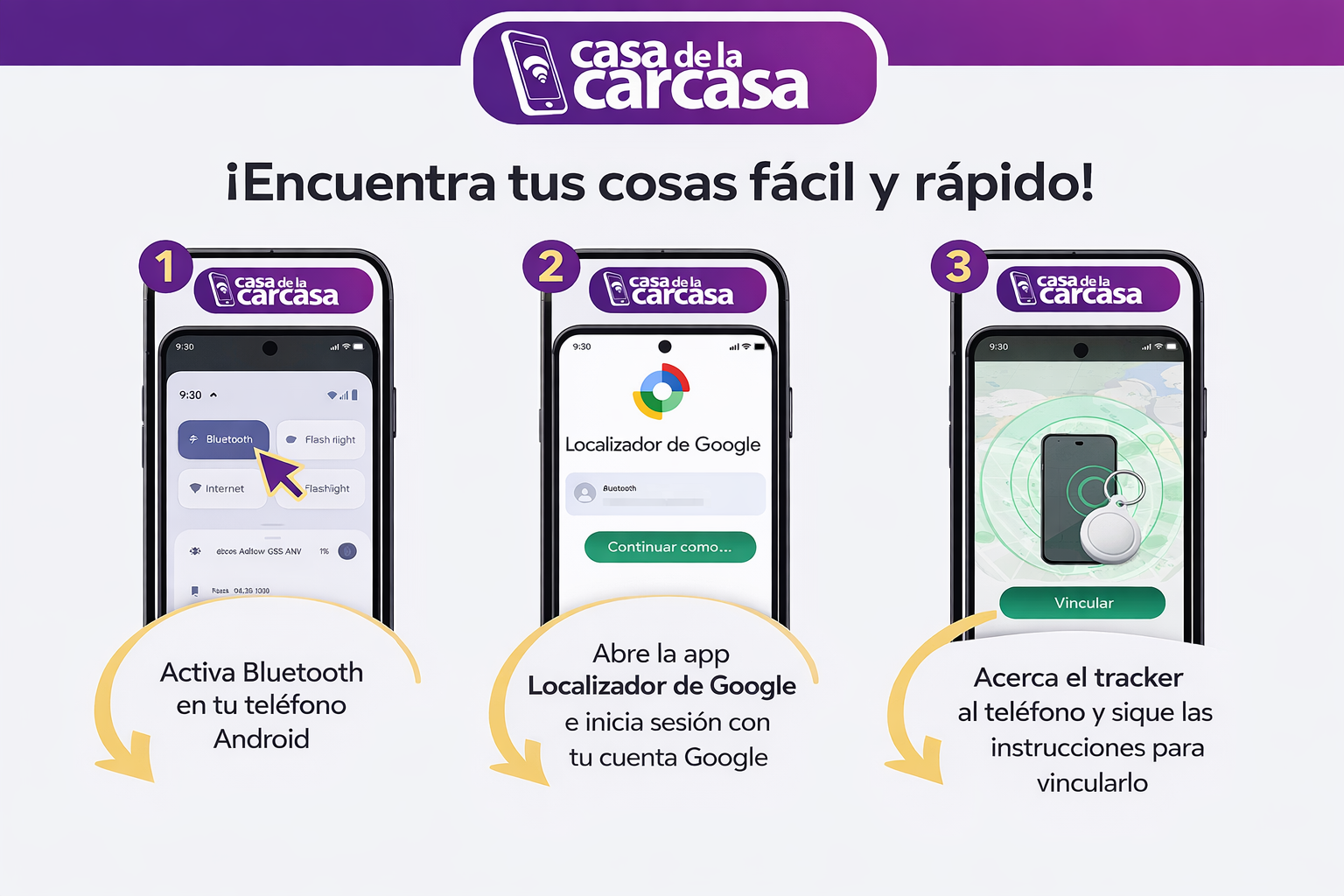 Solo debes enlazarlo a tu teléfono Android mediante Bluetooth y configurarlo con la app Localizador de Google (Find My Device). Una vez conectado, podrás revisar su ubicación y encontrar tus objetos de forma simple y rápida.