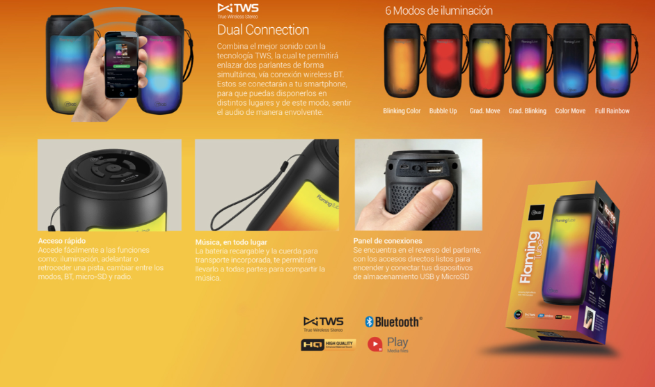 El Flaming Tube es un parlante compacto portátil ofrece una experiencia de audio y visual combinada, permitiéndote disfrutar de música de manera inalámbrica vía Wireless BT, mientras que las luces LED que cambian de color añaden un elemento visual llamativo. También podrá reproducir música desde dispositivos USB y tarjetas microSD, así como la posibilidad de sintonizar estaciones de radio.
