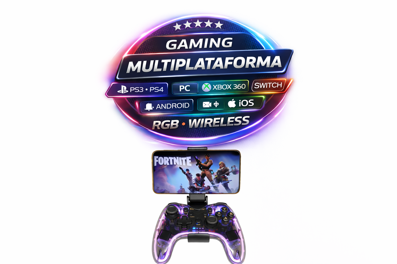 Disfruta una experiencia de juego más cómoda, dinámica y versátil con este gamepad inalámbrico Bluetooth de diseño gamer transparente oscuro. Su estética moderna con iluminación RGB, junto a sus funciones avanzadas como doble vibración, Turbo y Auto, lo convierten en una excelente opción para quienes buscan rendimiento y estilo en un solo control.